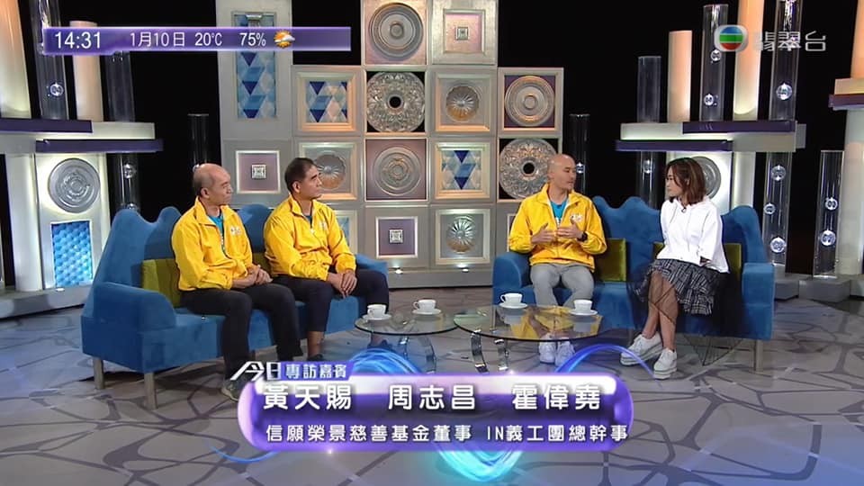 香港信願榮景慈善基金董事黃天賜、周志昌及IN義工團總幹事霍偉堯代表接受無線電視TVB今日VIP節目訪問。