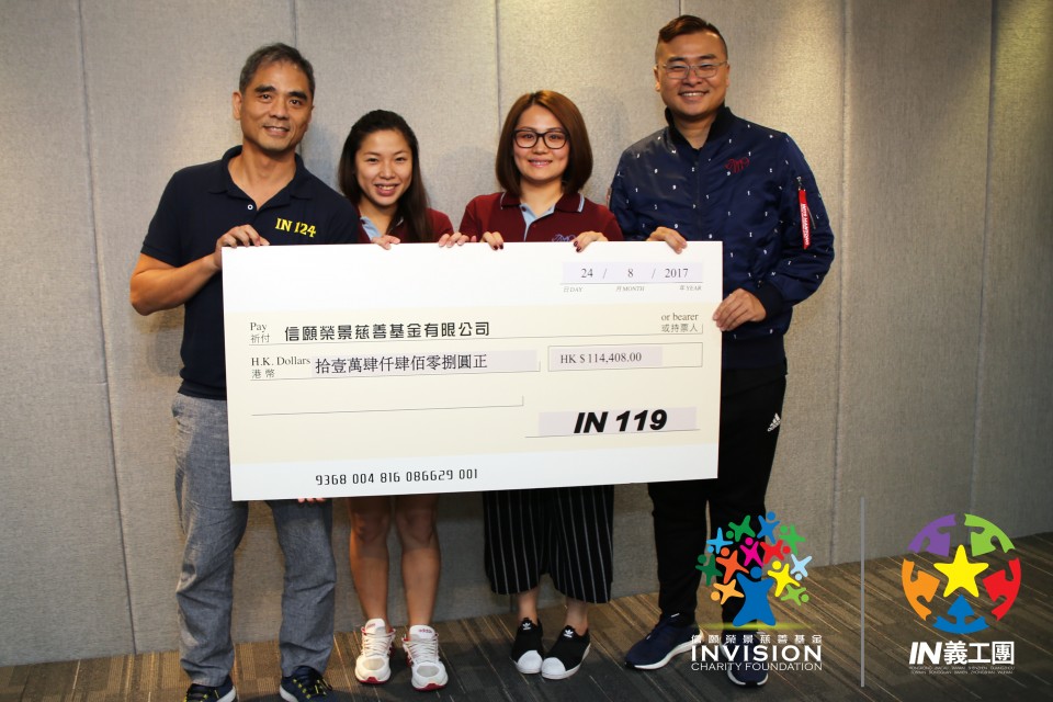 IN119早前把善款十一萬四千多元捐到信願榮景慈善基金,再透過基金會把當中八萬多元捐到路向四肢,以支持更多殘障人士。