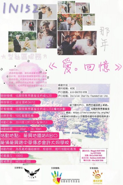 當日 IN 152 將會為長者們結婚照或家庭照以及進行活動和表演,在這寒冬之中送上一點溫暖!