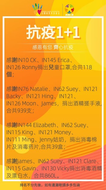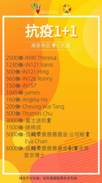 請大家繼續出力支持「1+1」計畫,我們一起成為陽光的源頭,齊心令抗疫行動更加豐盛!